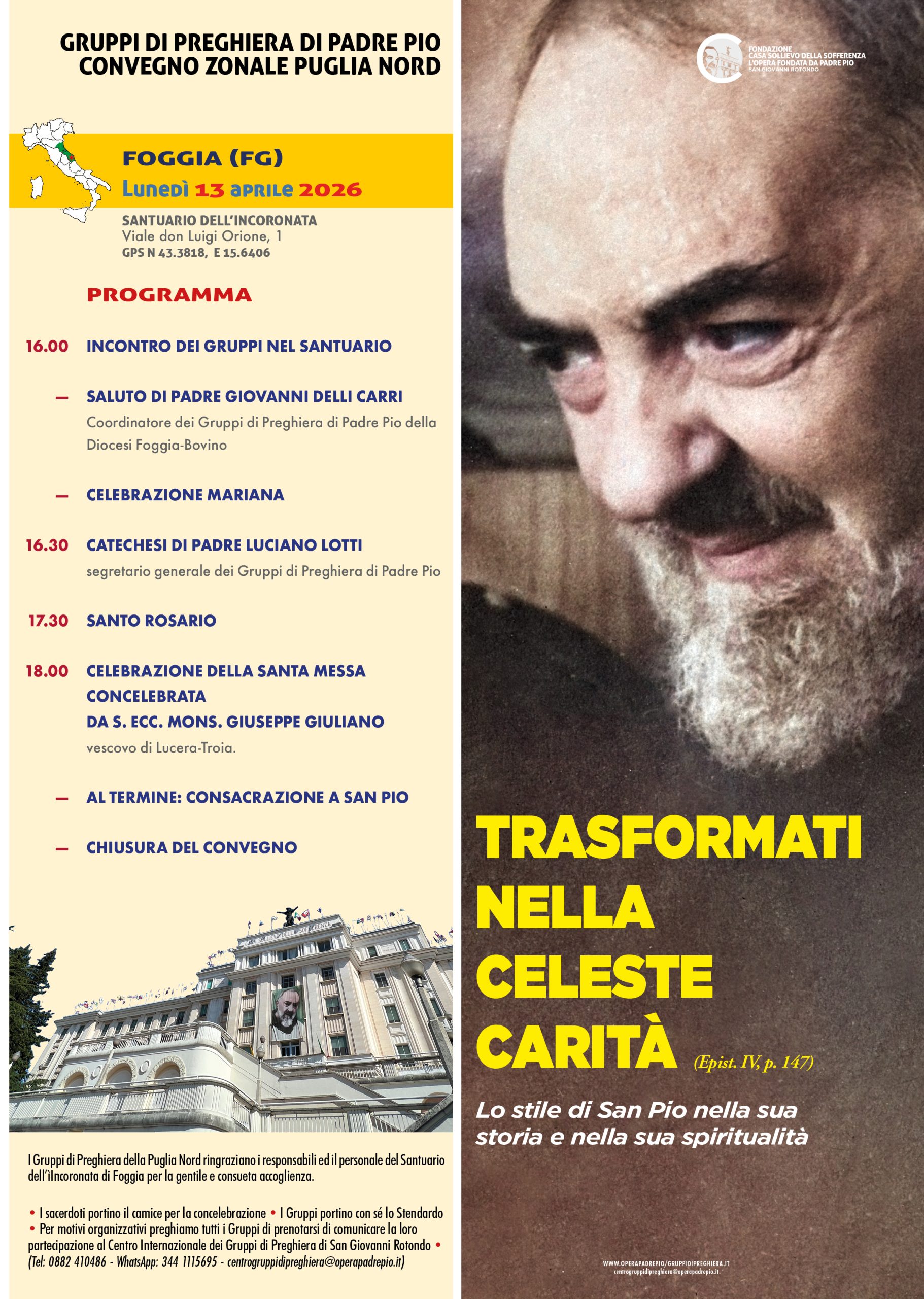Lunedì 13 aprile 2026 Mons. Vescovo ha presieduto la S. Messa alla Basilica-Santuario “Madre di Dio Incoronata” a Foggia in occasione del Raduno dei Gruppi di preghiera di P. Pio del Nord Puglia.
